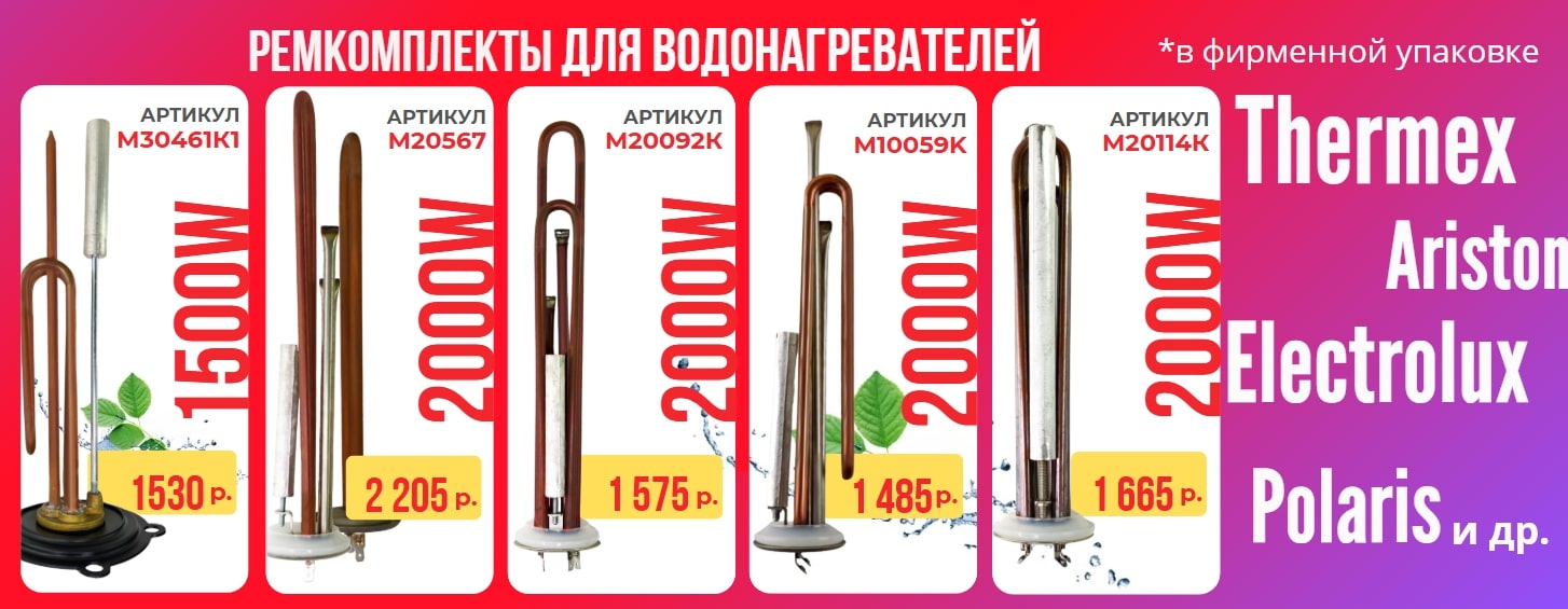 В ассортименте представлены ремкомплекты для популярных брендов: Thermex, Electrolux, Timberk, Ariston, Ballu, Polaris, Zanussi и многих других.